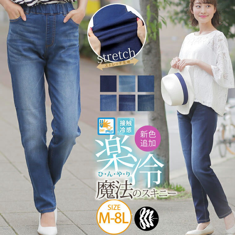 夏でもひんやり。足元に魔法をかけて。大きいサイズ レディース パンツ | 新色追加!! 接触冷感 UV 魔法の美ライン ストレッチ スキニー デニムパンツ _ オリジナル スキニーデニム スキニーパンツ デニンス LL LL+ 3L 4L 5L 6L 7L 8L [448028] OMMBT 夏 夏物 夏服 mcool mids