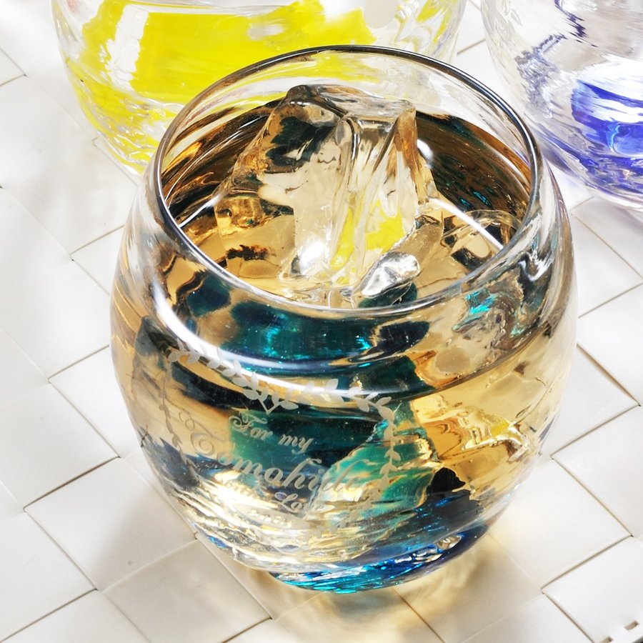 商品名:源河源吉 琉球ガラス 丸球ロックグラス ●Made in Okinawa ●BOX:当店オリジナルBOX ●彫刻込(片面) ●サイズ:幅8cm×高さ7.4cm ●口径:6.5cm