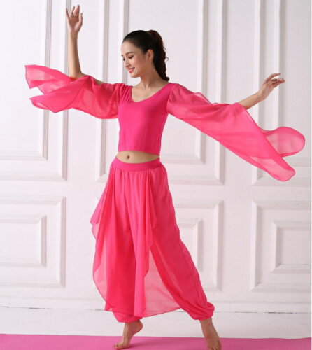 優雅な衣装 セットアップ ダンス ヒップホップ パンツ トップス スカーチョ ワイドパンツ ガウチョ チョリ へそ出し ショート丈 ツーピース 上下セット 長袖 ハーレムパンツ ベリーダンス シースルー シフォン ダンス衣装 ピンク cr3n-mcv